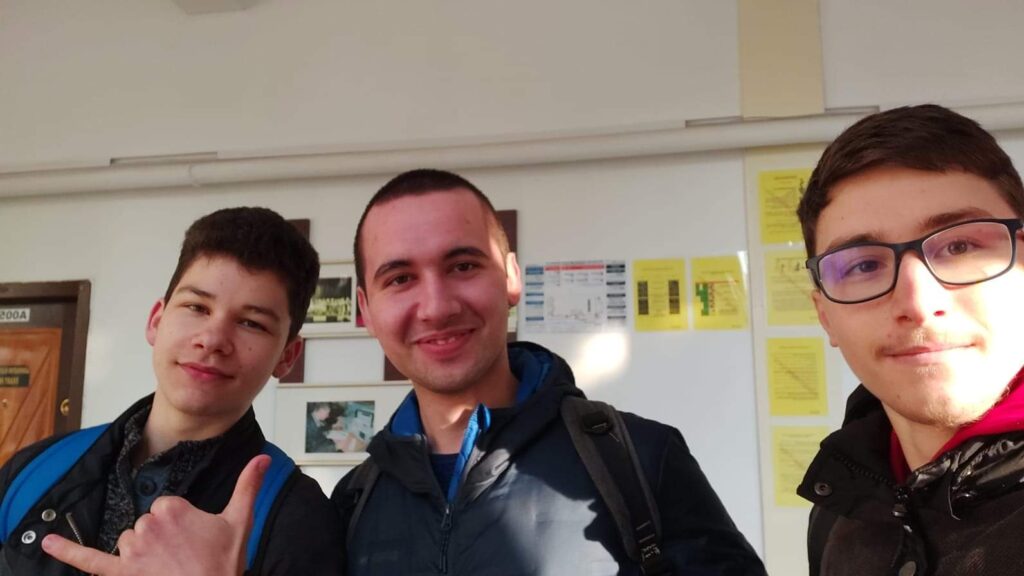 Cei trei elevi din clasa a XI-a B in Cluj-Napoca la faza Judeteana a Olimpiadei. In centru este elevul Moldovan Jose, calificat la faza nationala.